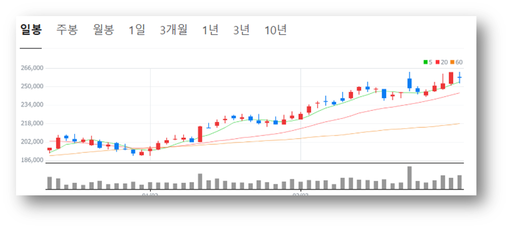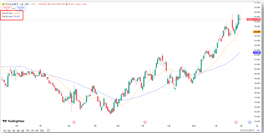 ✅ 현재 주가(257,500원)가 20일 & 50일 이동평균선 위에 위치