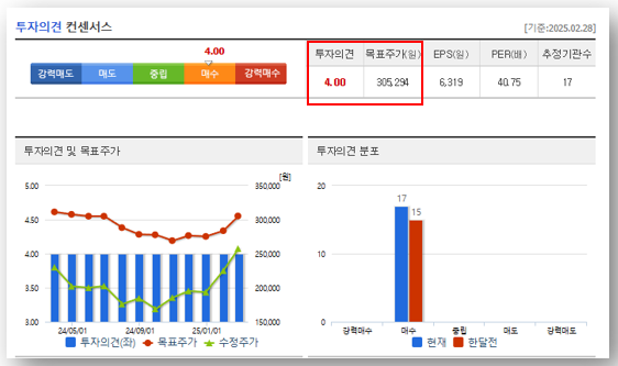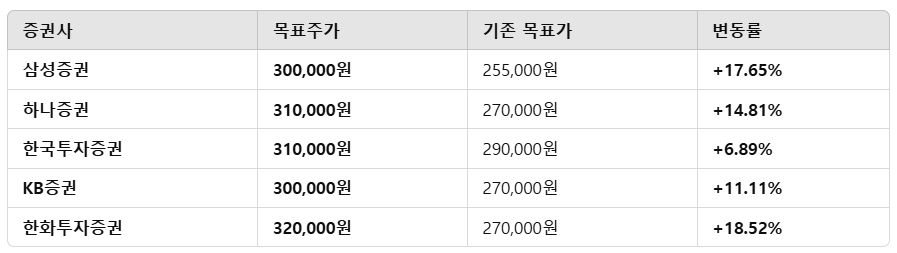 🔹 목표주가 평균: 305,000원