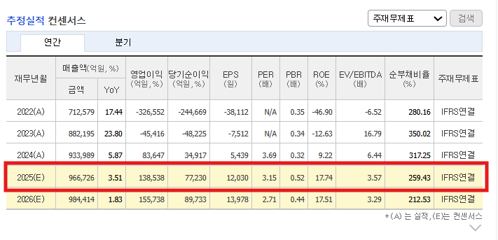 - 2025년 예상 매출: 966.7조 원 (+3.5% YoY)