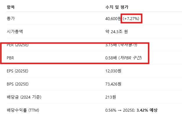 💡 PER 3.15배는 주요 대형 가치주 대비 매우 낮은 수준인데요, 이를 통해 주가가 오를 수 있는 상방이 많이 열려 있다고 보여집니다.