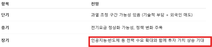중장기적으로 전력망 투자 + 요금 현실화 가능성 + 저평가 상태에서의 접근은 유효해 보입니다.
