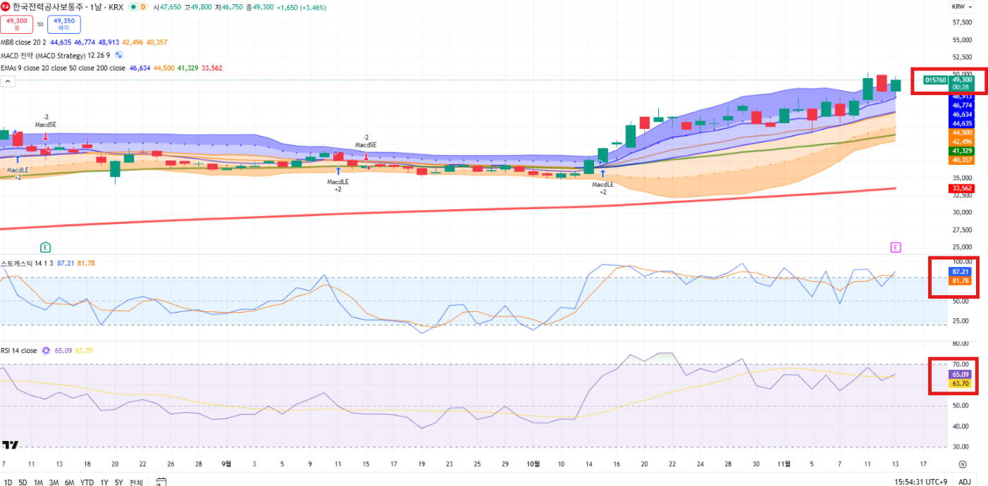 • 볼린저밴드 상단 돌파 중: 강한 추세 지속