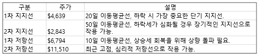 - 1차 저항선: 10일 이동평균선($6,794) 주가가 상승세를 회복하려면 10일선을 상향 돌파해야 함.