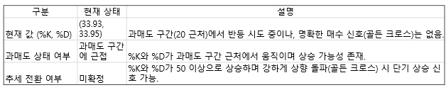 %K이 33.93, %D값이 33.95로 과매도 구간인 20에 가까운 상태에서 반등 시도를 보이고 있는데요, 하지만 %K와 %D값이 아직 과매도 구간에 근접해 있으며, 뚜렷한 매수 신호(골든 크로스)가 발생하지 않은 상태입니다.