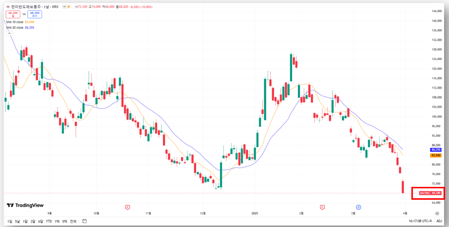2025년 3월 31일 기준, 한미반도체는 전 거래일 대비 -10.85% 하락한 68,200원으로 마감했습니다. 이는 52주 최저가(68,000원)와 거의 같은 수준으로, 기술적으로도 중요한 지지선을 시험하는 구간입니다.