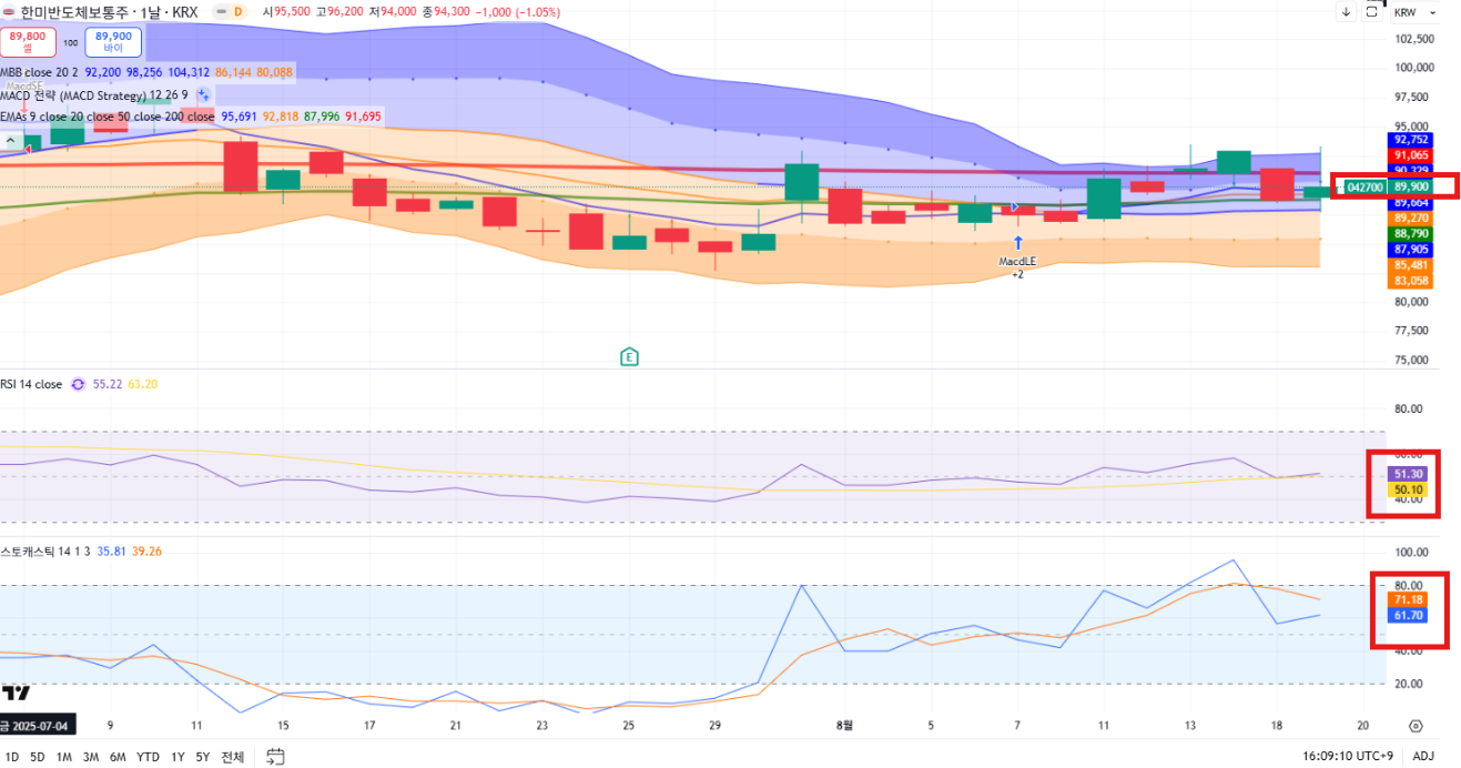 - 볼린저 밴드: 중심선(약 9만원) 부근에서 횡보 중