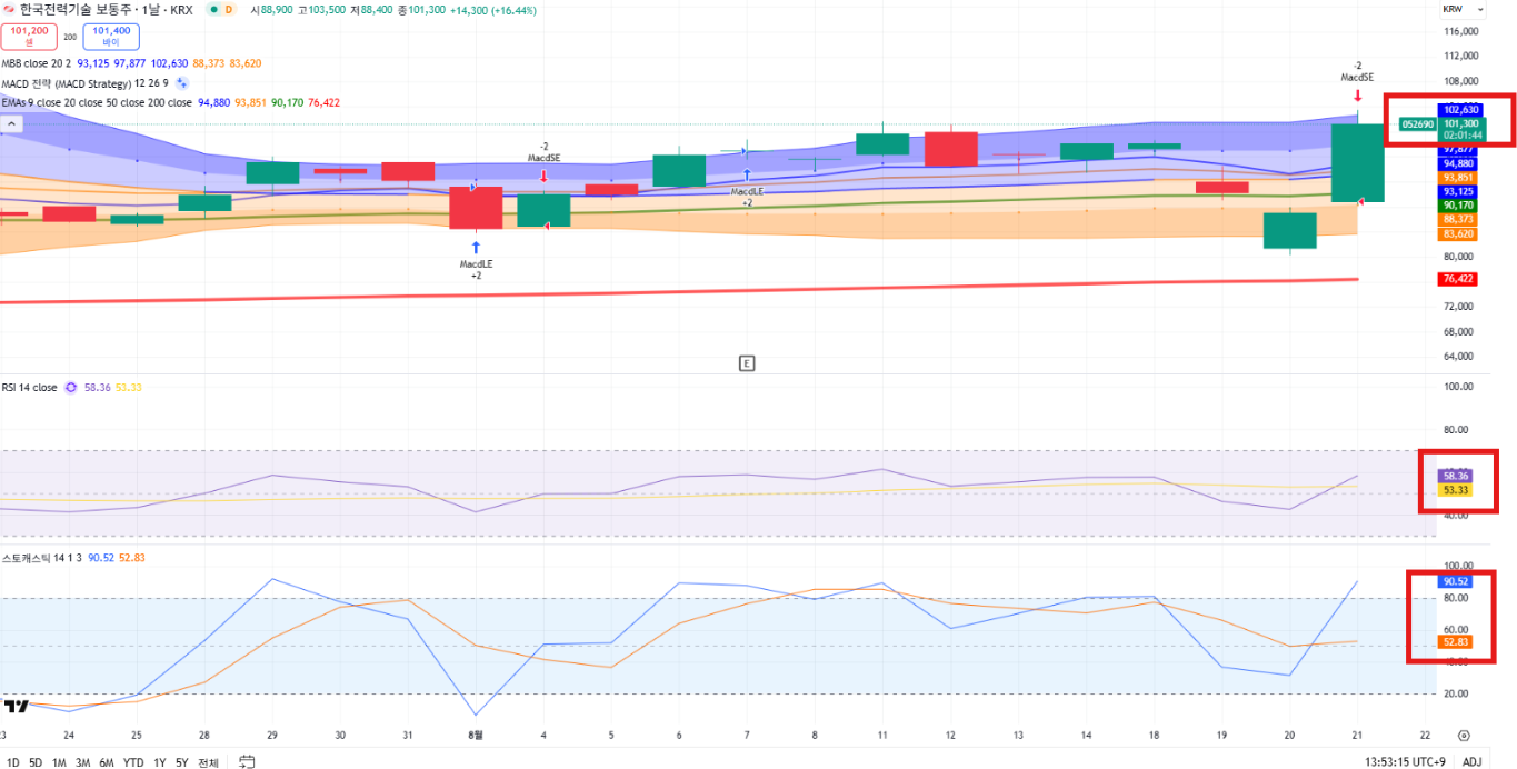 안녕하세요! 한전 기술이 8.21 장중 99,500원을 기록중인데요, 이는 전날보다 14.37% 상승 중이며, 저가 매수에 나선 투자자들의 수급으로 인한 상승으로 보여집니다. 자세한 주가 흐름과 전망에 대해 알아보겠습니다!