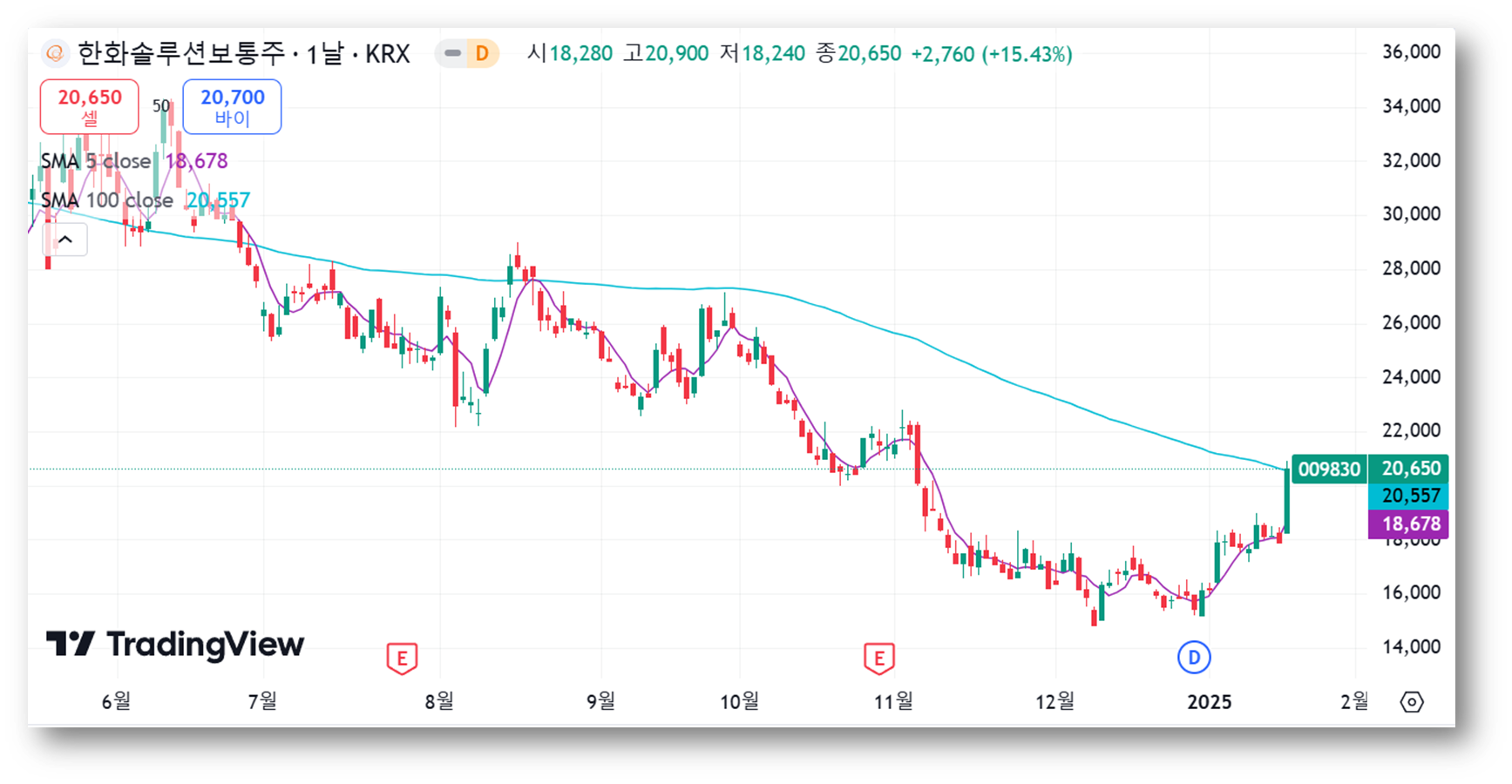 장기적인 관점에서, 주가는 현재 100일 이동평균선(20,577원) 근처에 위치하며, 이 선이 중요한 저항선으로 작용하고 있습니다. 주가가 100일선을 돌파하면 중장기 상승세로 전환될 가능성이 크지만, 돌파하지 못할 경우 단기 조정이 발생할 수 있어 보입니다.