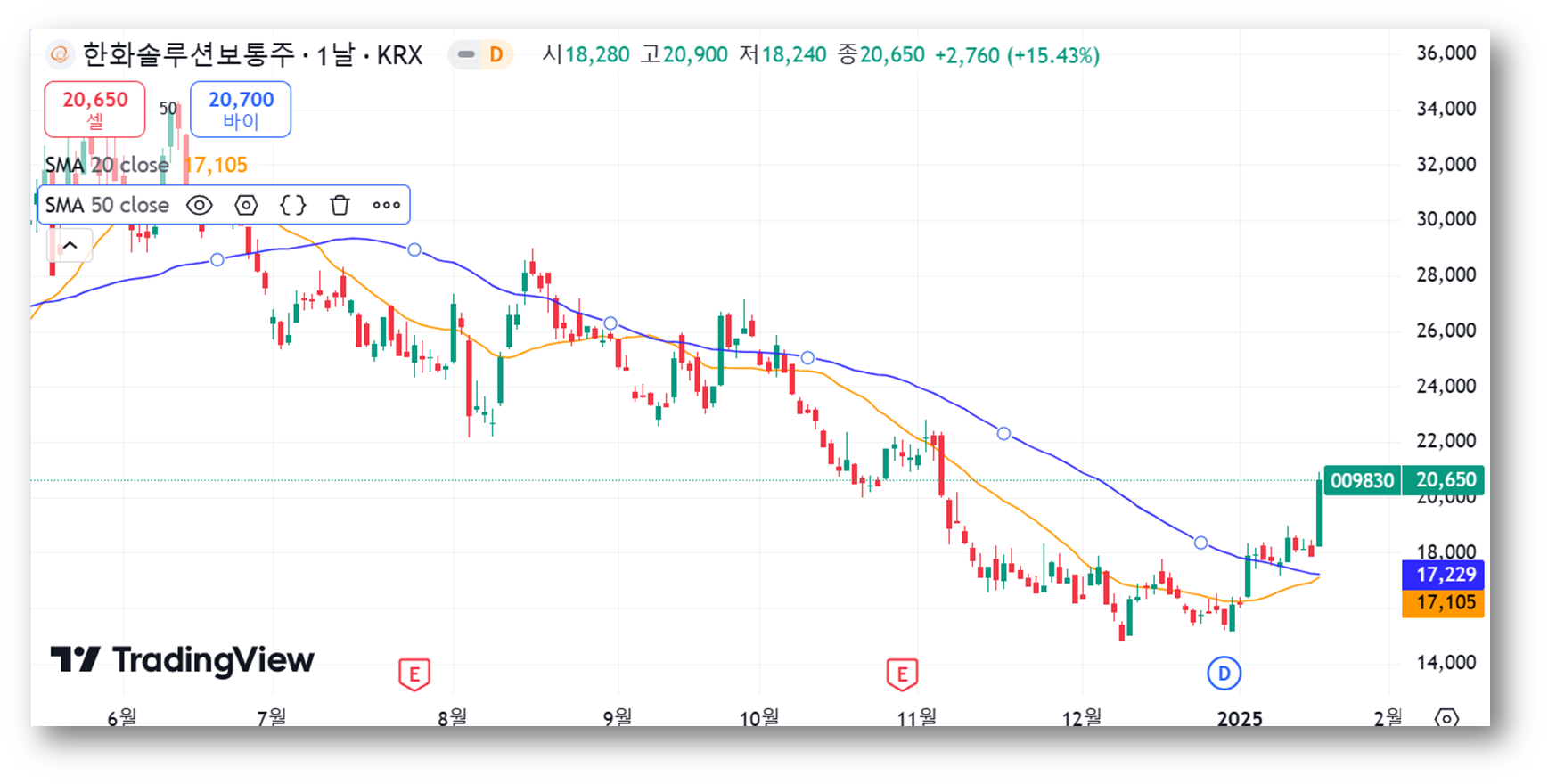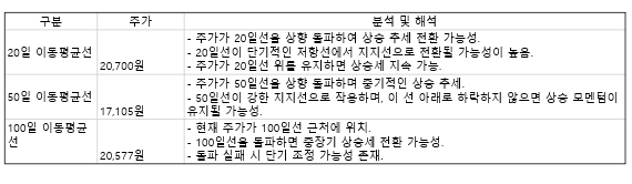 현재 주가는 20일 이동평균선(20,700원)과 50일 이동평균선(17,105원)을 모두 상향 돌파한 상태로, 단기 및 중기 상승 추세로 전환될 가능성을 보여주고 있습니다.