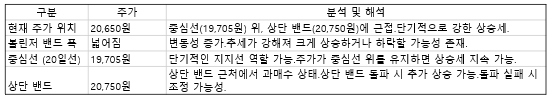 중심선인 19,705원 부근은 단기적인 지지선으로 작용할 가능성이 있는데요, 주가가 중심선 위를 유지하면, 상승세가 지속될 가능성이 커보입니다.