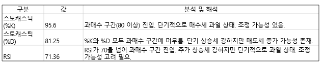 스토캐스틱 값이 95.60으로 과매수 구간(80 이상)에 진입한 상태인데요, 이는 단기적으로 매수세가 과열되어 있음을 나타내며, 조정 가능성이 있음을 보여줍니다.