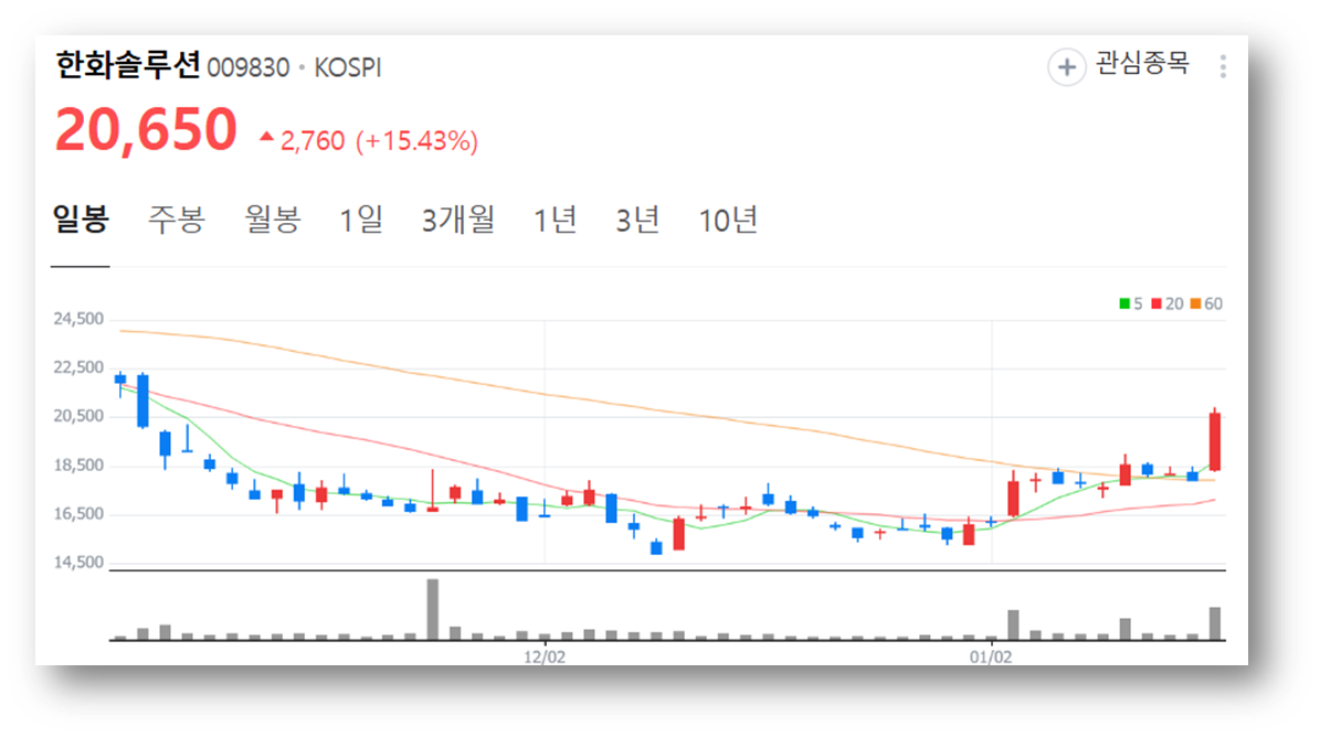한화솔루션 주가가 미국의 대중국 제재 가능성에 힘입어 급등세를 보였는데요, 1월 15일 전 거래일 대비 15.43% 상승한 20,650원에 마감했으며, 태양광 관련주들도 전반적으로 강세를 보였습니다.