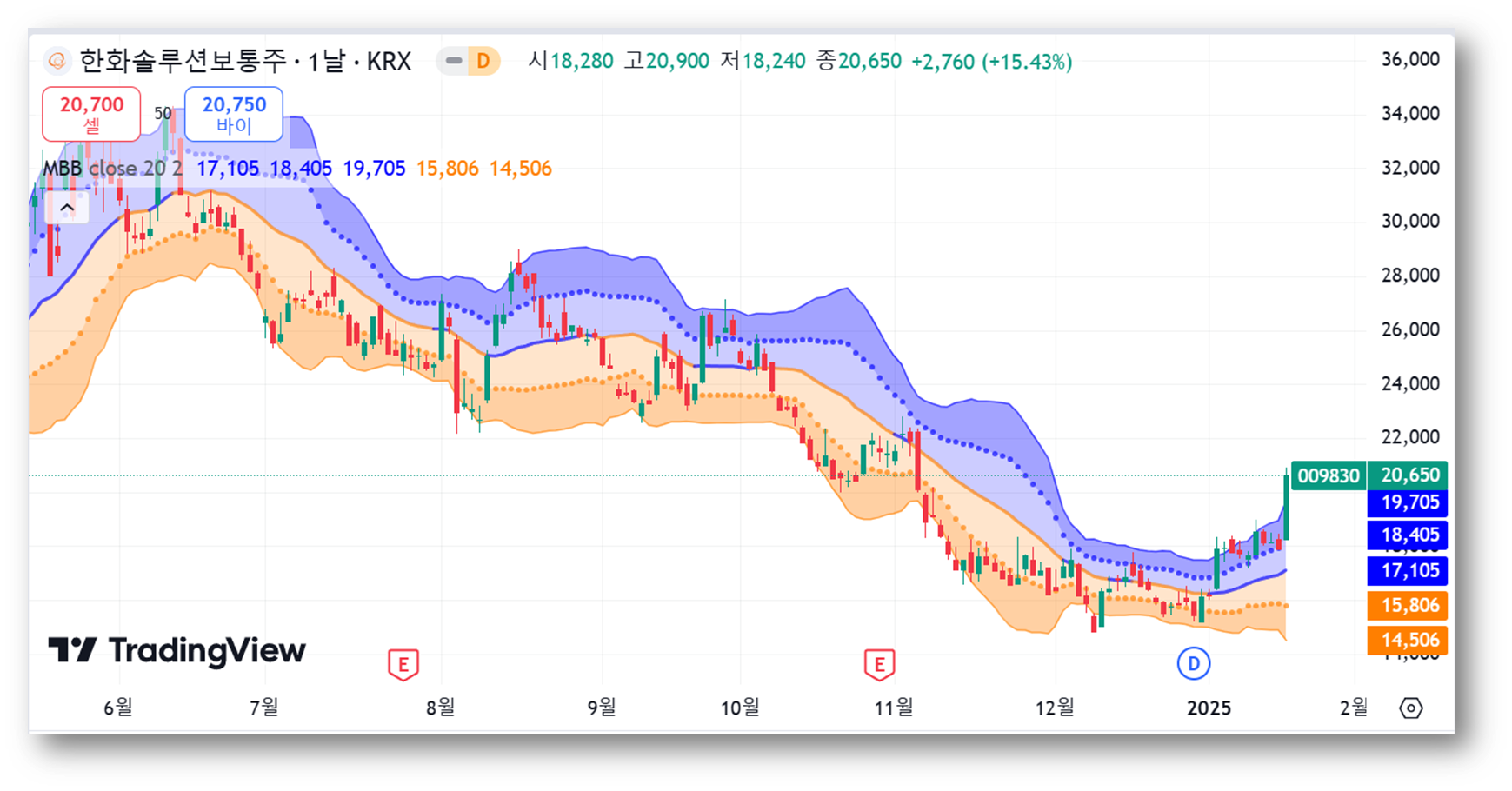 현재 주가는 20일 이동평균선(20,700원)과 50일 이동평균선(17,105원)을 모두 상향 돌파한 상태로, 단기 및 중기 상승 추세로 전환될 가능성을 보여주고 있습니다.