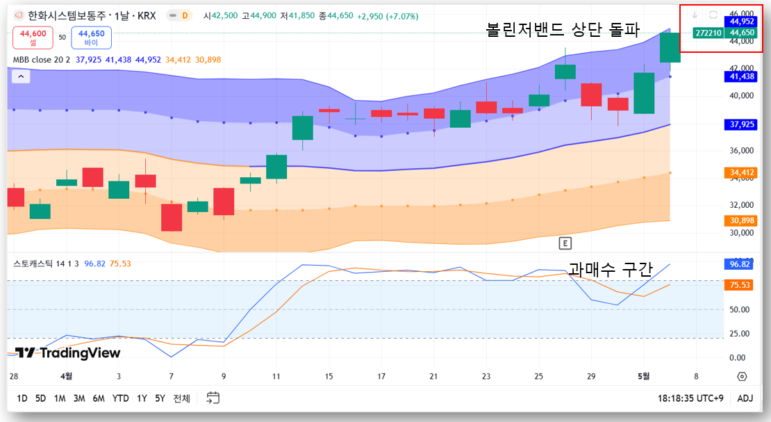 한화시스템 주가는 4월 말부터 급격히 상승세를 보이고 있으며, 5일 이동평균선과 20일선 위에서 강한 지지를 받는 모습입니다. 특히 최근 종가 기준으로 볼린저밴드 상단 돌파, 스토캐스틱 과매수 구간 진입(96.82) 등 기술적 과열 신호도 감지됩니다.