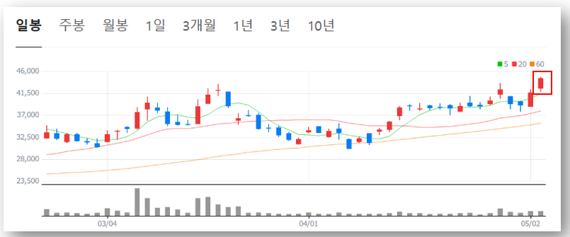 - 2025년 5월 2일 종가: 44,650원 (+7.07%)