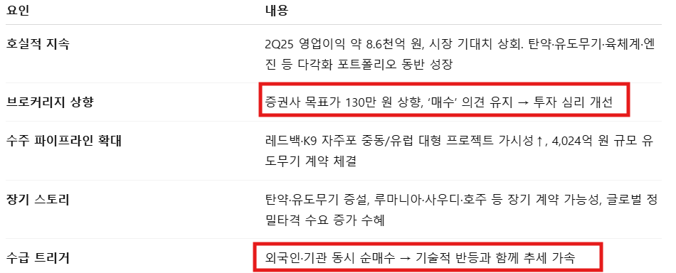 - 2Q25 실적이 시장 기대 상회(영업이익 8.6천억대). 탄약/유도무기·육체계·엔진 등 멀티 포트폴리오가 동시 성장.