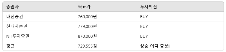 👉 현재가 기준(63만원대)으로 보면 최대 30% 이상의 상승 여력이 있다고 평가되고 있습니다.
