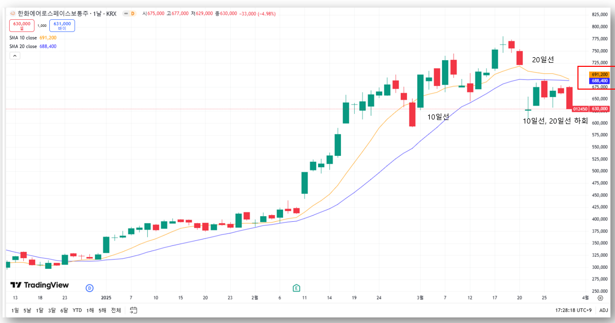 - 최근 고점에서 조정 중 (10일, 20일선 하회)