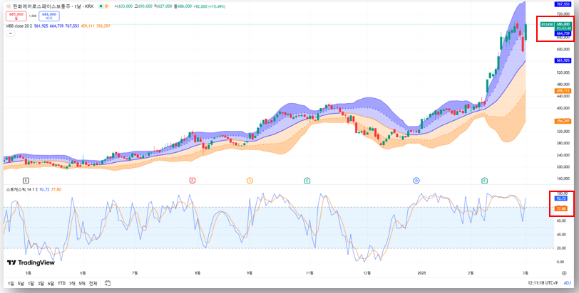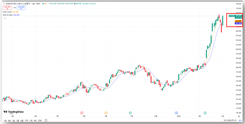 한화에어로스페이스는 올해 초 320,000원대에서 시작해 불과 두 달 만에 두 배 이상 상승하며 방산주 강세를 주도하는 대표적인 종목으로 자리 잡았다.