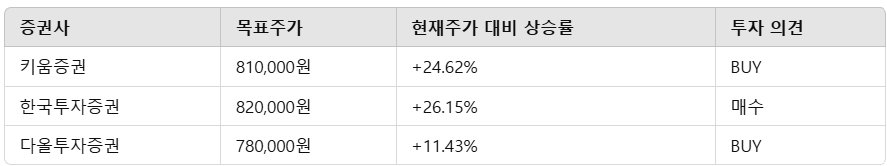 💡 현재 증권사들의 평균 목표주가는 800,000원 내외로 설정되어 있으며, 추가 상승 여력이 충분하다는 평가를 받고 있다.