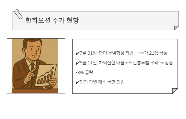 한화오션은 단기 급등 후 조정에 들어섰지만, 대미 수출 관세 인하·친환경 선박 시장 확대 등 중장기 호재가 많습니다.