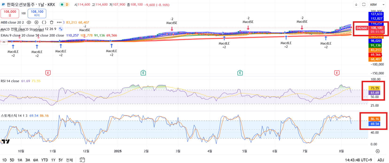 • 볼린저 밴드: 상단 부근에서 저항, 중심선은 98,000원 부근