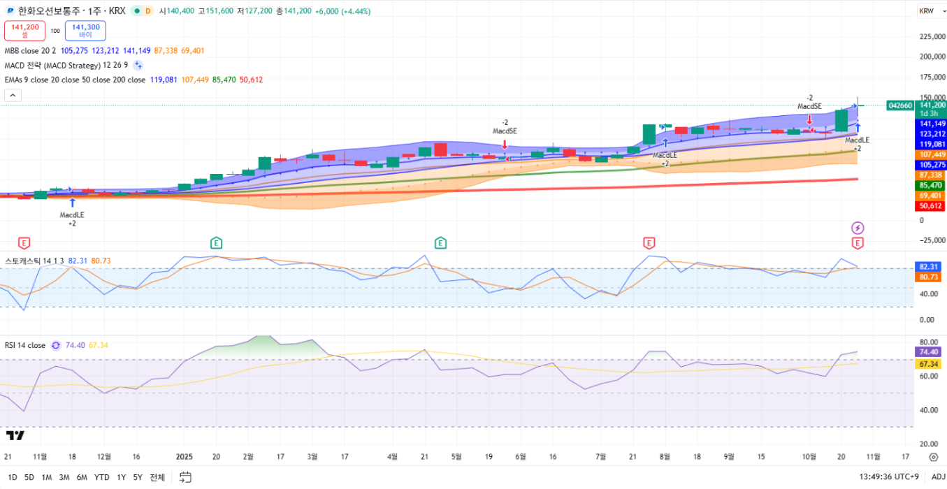 - RSI 74.40 / 스토캐스틱 82.31 → 강한 매수세 속 과매수 구간.