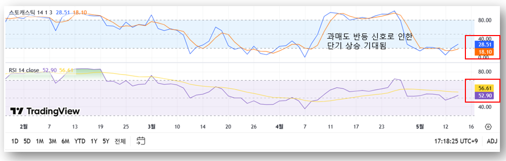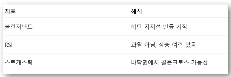 - 스토캐스틱: 과매도 반등 신호 → 단기 상승 기대