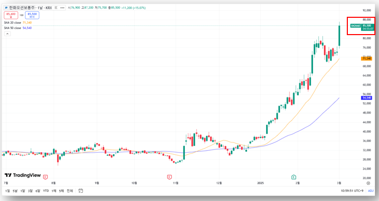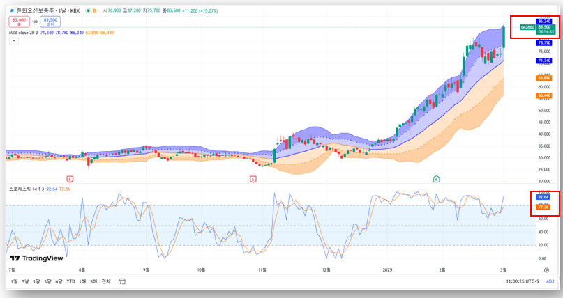 한화오션은 미국의 중국 선사 규제, LNG 운반선 발주 증가, 트럼프 정책 수혜 기대감 등의 영향을 받아 강세를 보이고 있다. 기술적 지표상 단기 과열 구간이지만 장기적인 성장성은 여전히 유효하므로 저가 매수 전략이 유효할 수 있다.