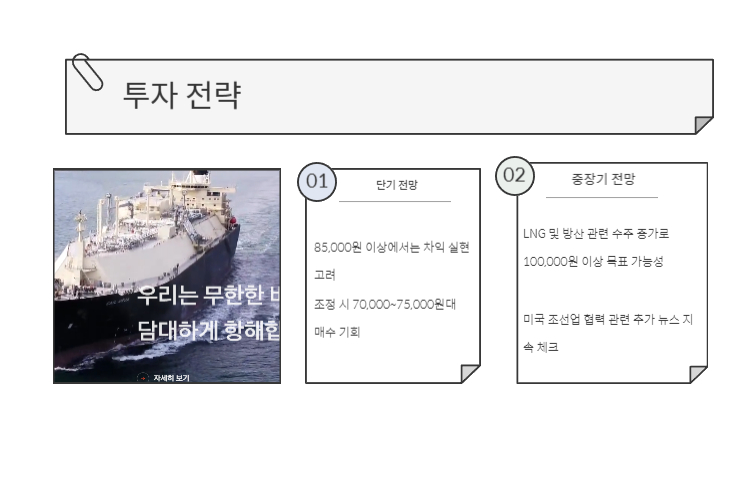 - LNG 및 방산 관련 수주 증가로 100,000원 이상 목표 가능성