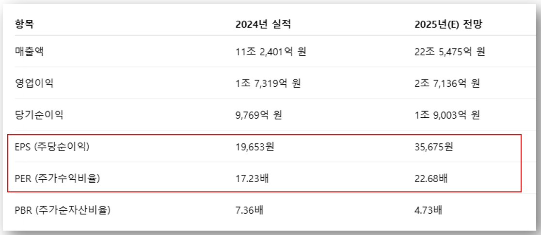 📈 2025년 매출과 영업이익 모두 대폭 성장할 것으로 전망되며, EPS 기준 주당 35,675원으로 추정되어 향후 주가 상승 여력이 매우 큽니다.