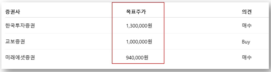 💡 평균 목표주가는 약 1,080,000원 수준으로, 현재가 대비 상승 여력 약 33%로 평가받고 있습니다.