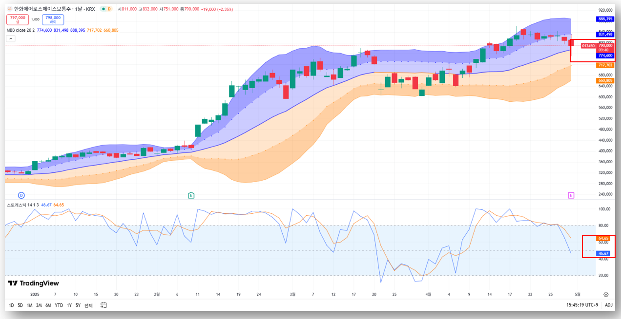 - 기술적 흐름: 최근 과열 조정 구간, 스토캐스틱 RSI 하락 중 → 단기 눌림 가능성