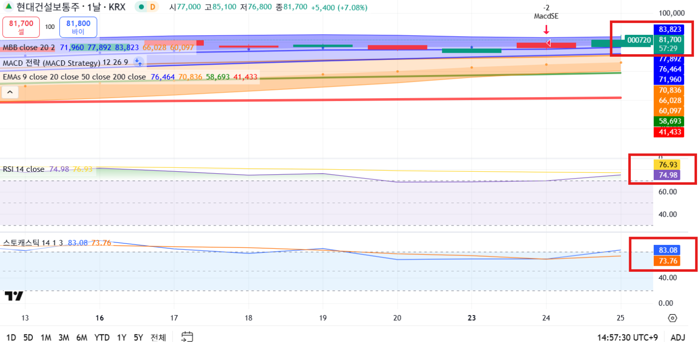 - 스토캐스틱: 83.08 / 73.76 (과매수 경계)