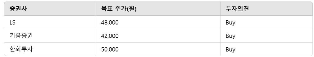 대부분 증권사들이 매수 의견을 유지하며 목표 주가를 41,684원~50,000원 사이로 제시.