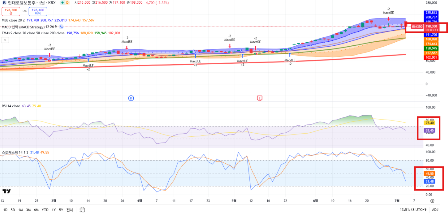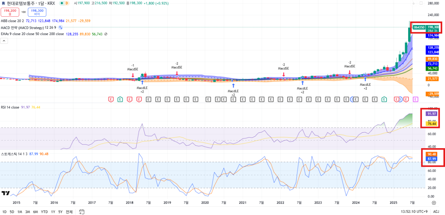 - RSI(일봉): 63.45, 주봉 RSI: 77.60, 월봉 RSI: 91.97 → 과매수 구간 진입