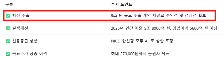 💡 증권사들은 디펜스솔루션 부문의 안정적인 수익성과 수주잔고 증가를 근거로 강력한 ‘매수’ 의견을 유지 중입니다.