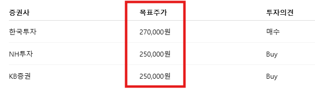 - 3개월 평균 목표주가: 약 250,000~270,000원
