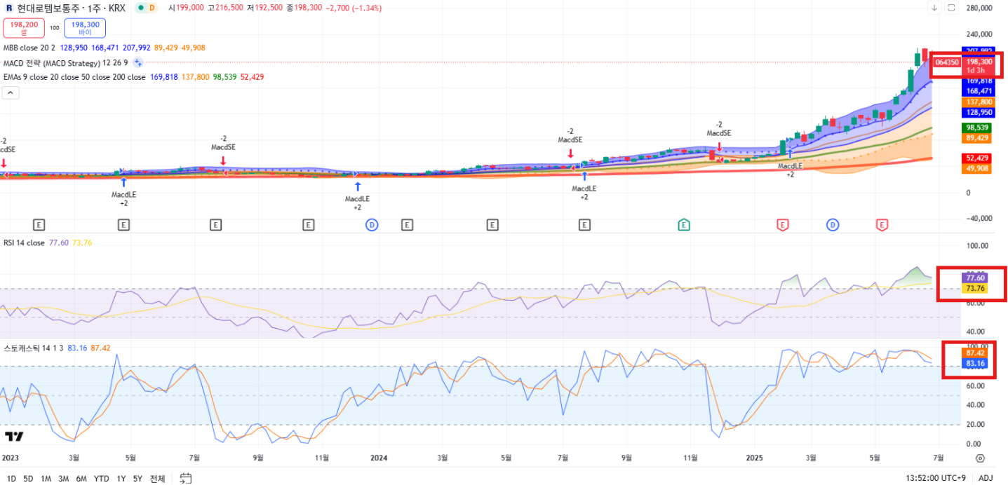 - RSI(일봉): 63.45, 주봉 RSI: 77.60, 월봉 RSI: 91.97 → 과매수 구간 진입