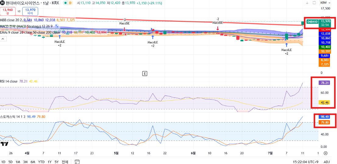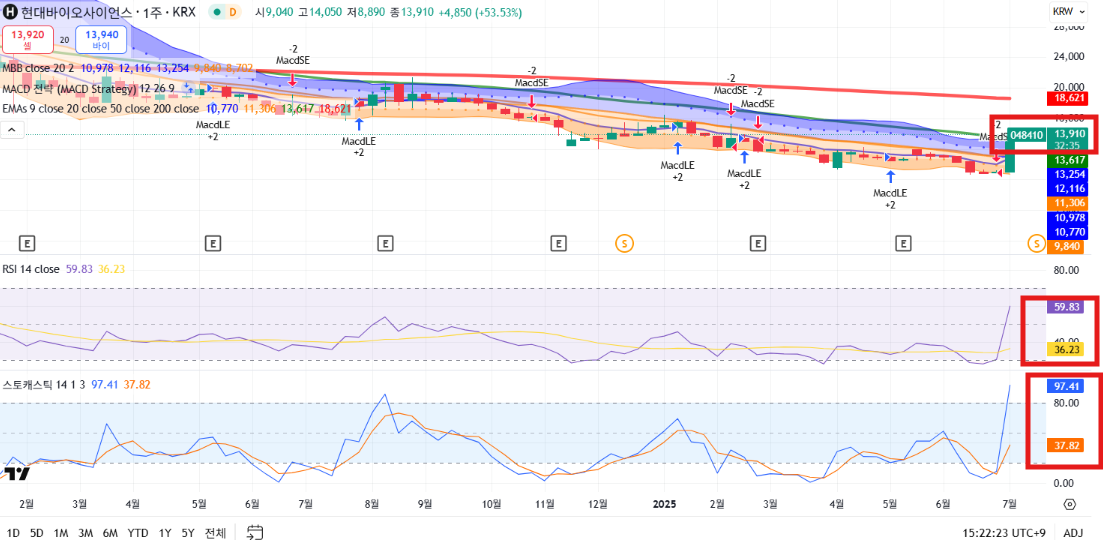 현대바이오는 무상증자 발표 이후 단기 급등했으나, 기술적으로 과열 구간에 진입해 단기 조정 가능성에 유의해야 합니다!