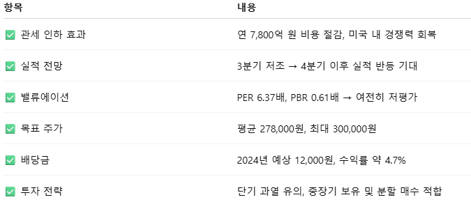 4분기부터는 관세 인하 효과가 반영되며 실적 반등 기대가 커지고 있습니다.