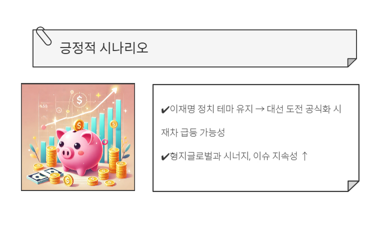 - 이재명 정치 테마 유지 → 대선 도전 공식화 시 재차 급등 가능성