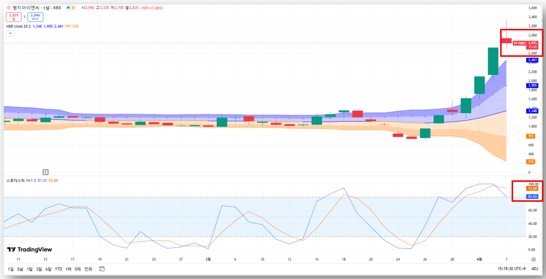 - 일봉 차트 기준으로 단기 과열 구간 진입
