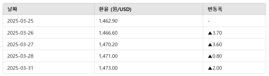 - 2025년 3월 환율은 달러 기준 1,472.9원으로 금융위기 이후 최고치 기록