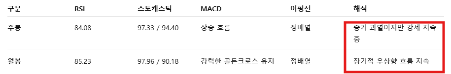 📌 요약: 단기 과열 상태이나, 거래량과 모멘텀이 유지되며 추세 지속 가능성 매우 높음