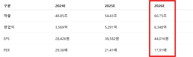 📌 2025~2026년까지 지속적 이익 증가 + PER 하락 → 투자 매력 상승
