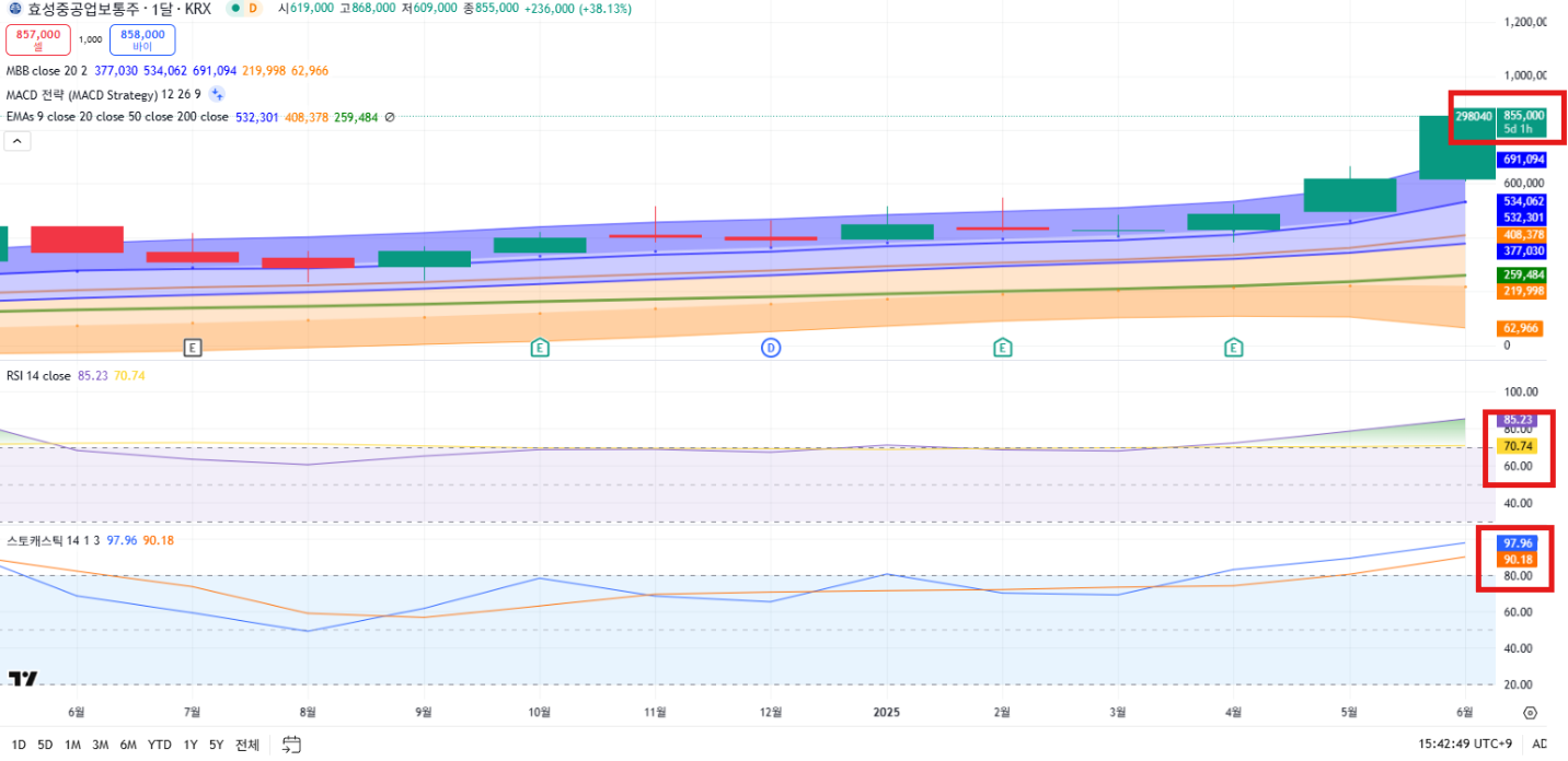효성중공업(298040)의 주가가 폭발적인 상승세를 기록하며 856,000원에 마감했는데요, 전력 인프라 수요 확대, 미국 수출 확대, 글로벌 수주 증가 등 여러 호재가 겹치면서 52주 최고가(868,000원)에 바짝 근접했습니다.