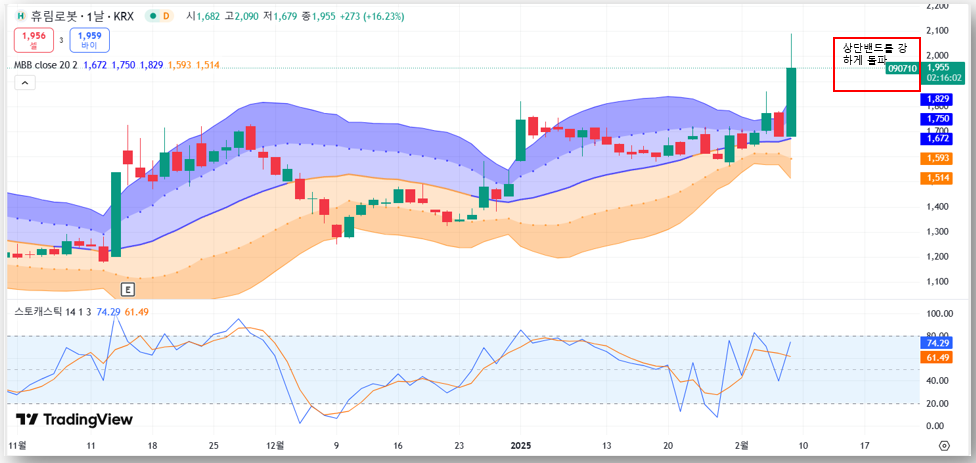 - 볼린저 밴드 상단 돌파: 강한 상승 모멘텀 형성