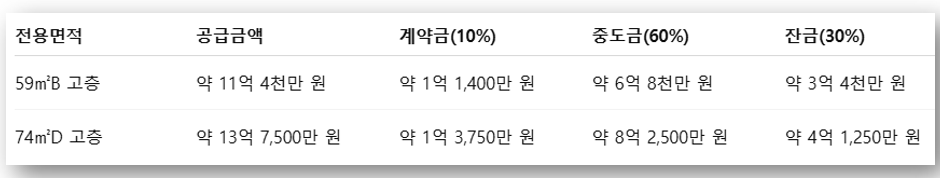 분양가는 층별 및 타입에 따라 차이가 있으며, 계약금 10%, 중도금 60%, 잔금 30%의 일반적인 분납 방식이 적용됩니다.