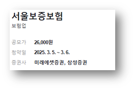 | 서울보증보험 수요 예측 결과와 공모가 (청약 일정) (0) | 2025.03.04 |